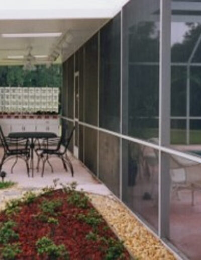 Typically, combination style pool enclosures incorporate our solid insulated composite aluminum roof system which attaches to the eave of the home. This high strength, walkable roof system affords a rain proof environment which serves as an intermediary element between the house and screened portion of the pool enclosure. The interface between the solid and screen portions consists of a carrier beam and structural super gutter combination that is almost entirely open, so that there is no impediment to the flow of movement between the solid and screened area.