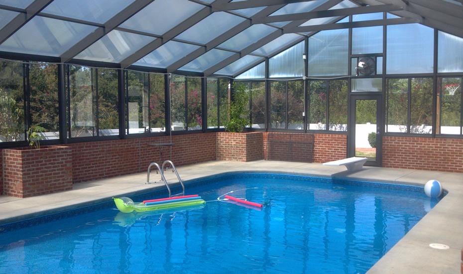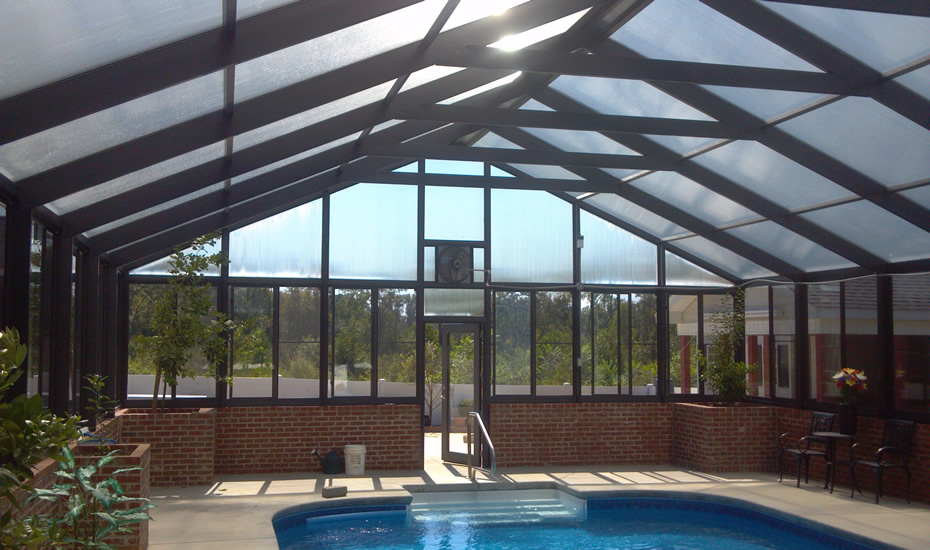For those looking for a completely enclosed swimming pool which affords rainproof, all season protection, All Custom Aluminum offers a line of solid pool enclosures. If you are looking to keep out the rain, we offer a polycarbonate insulated roof which allows light to pass through while keeping you dry inside. We also design and build enclosures which utilize structural insulated composite roof systems for those concerned with sun exposure. Either product allows the enclosure of the open walls with a window system which can complete the insulation of the space.
