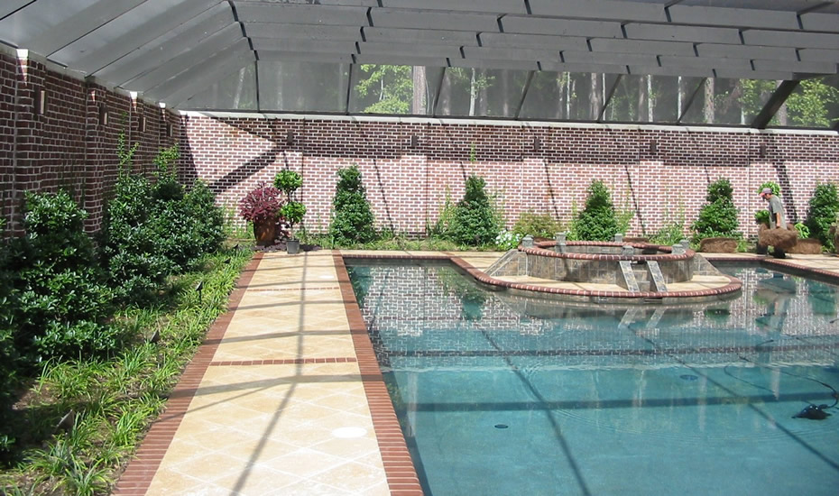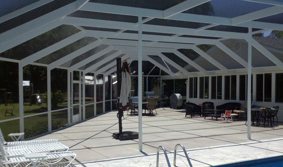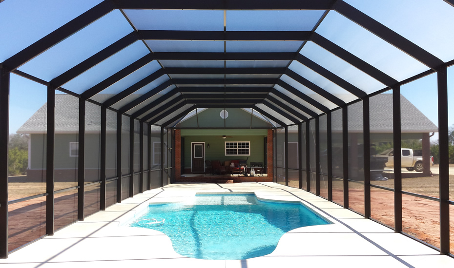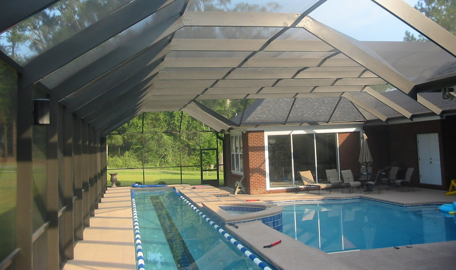 Mansard style pool enclosures can be made to span two or more areas of different widths. Gables and mansard roof styles can be integrate to wrap around corners. And oddly shaped areas with angled perimeters can be enclosed without resorting to delineating out rectangles with the use of carrier beams, which translates into better, more aesthetically pleasing designs.