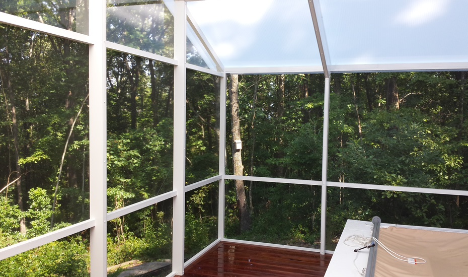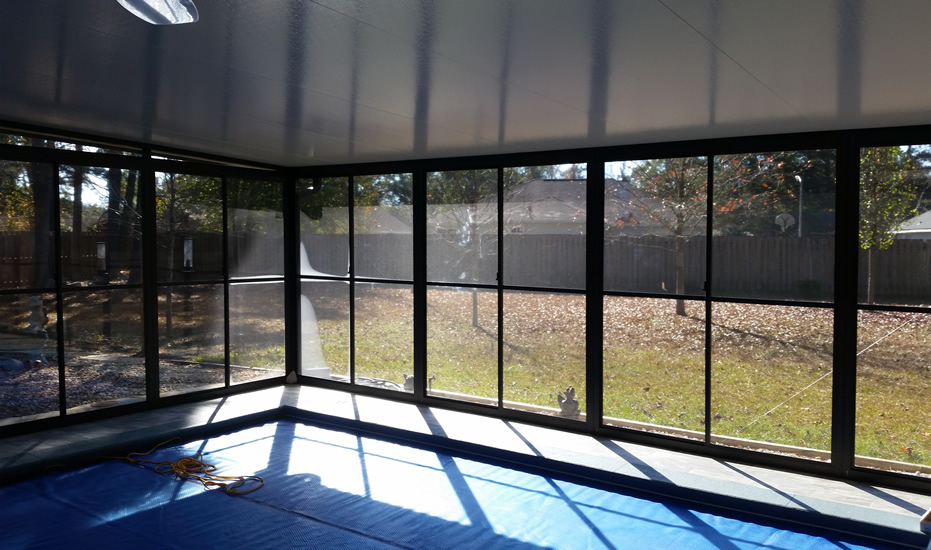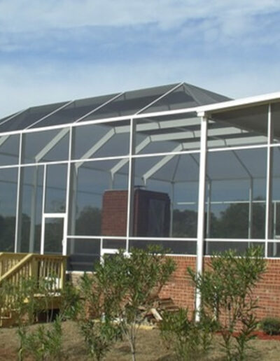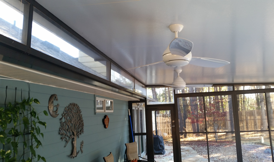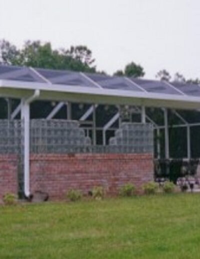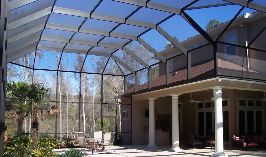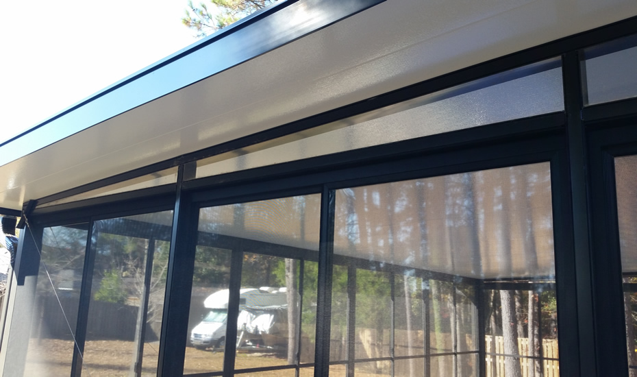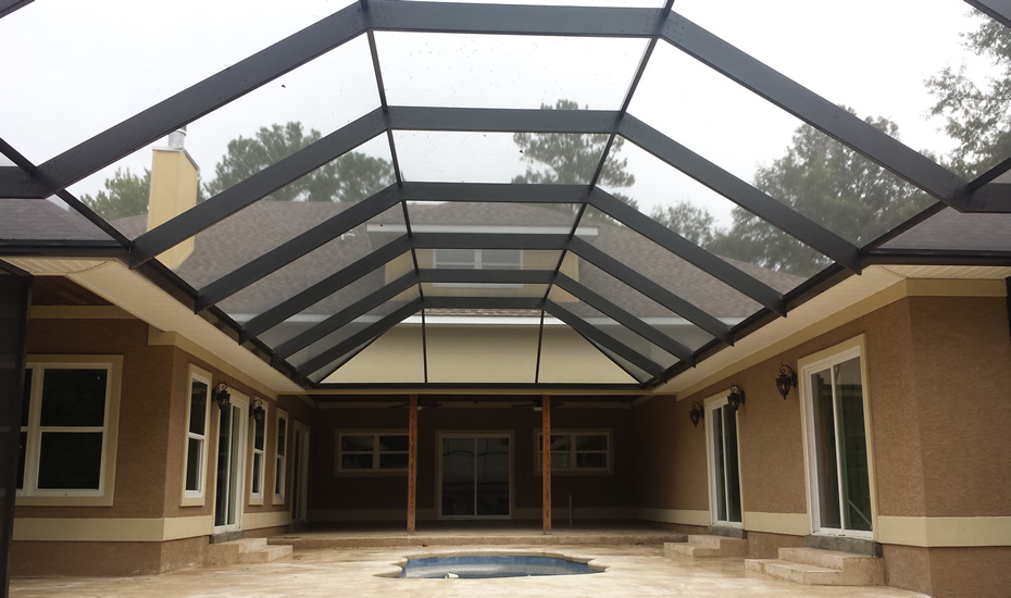 Polycarbonate roof systems are comprised of a high strength ply of polycarbonate on the underside and top of the sheet with an insulative, tubular core. The panels can vary in thickness and are engineered to apply to an aluminum framework much like screen. Many times stronger than glass, this high quality material sheds water while letting sunlight through with superb clarity.